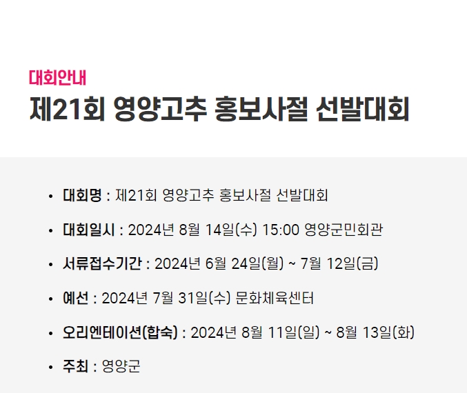 2024년 제21회 영양고추 홍보사절 선발대회일정 페이지 정보 작성자 관리자 작성일 24-05-14 15:56 첨부파일 본문 2024년 제21회 영양고추 홍보사절 선발대회 일정 목록 이전글 6월 24일(월) 9시 부터 서류접수가 시작됩니다!! 24.06.21 다음글2022년 제20회 영양고추아가씨 당선자 22.08.24